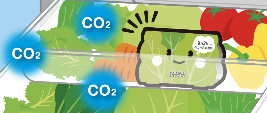 - 新鮮番から炭酸ガス(二酸化炭素)を発生させ、野菜室内の二酸化炭素の濃度を高め低酸素状態にすることで、野菜の老化の原因となる呼吸活動を穏やかにし、眠らせるように保存することで鮮度を守ります。