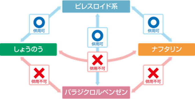 一方、パラジクロルベンゼン、ナフタリン、しょうのうは、併用するとお互いに影響しあい、薬剤が溶けて衣類のシミや変色に繋がるおそれがございます。
