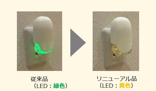 『消臭力プラグタイプ』の本体は、「(夜間などに)緑色のライトが眩しい」「空間に馴染むように優しい色にしてほしい」といったお客様の声から、2026年春にLEDライトの色を「緑色」から「黄色」に変更し、